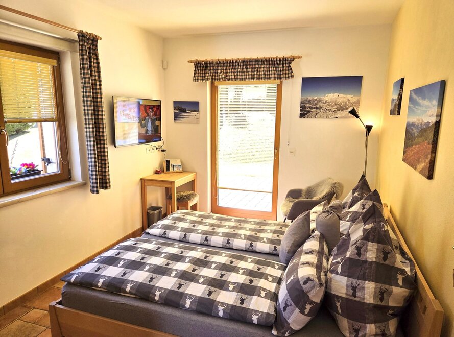 Romantyczne mieszkanie BERGTRÄUME oferuje 1 sypialnię z podwójnym łóżkiem, szafą, małym stołem z hokerem, telewizorem oraz dostępem do tarasu.
