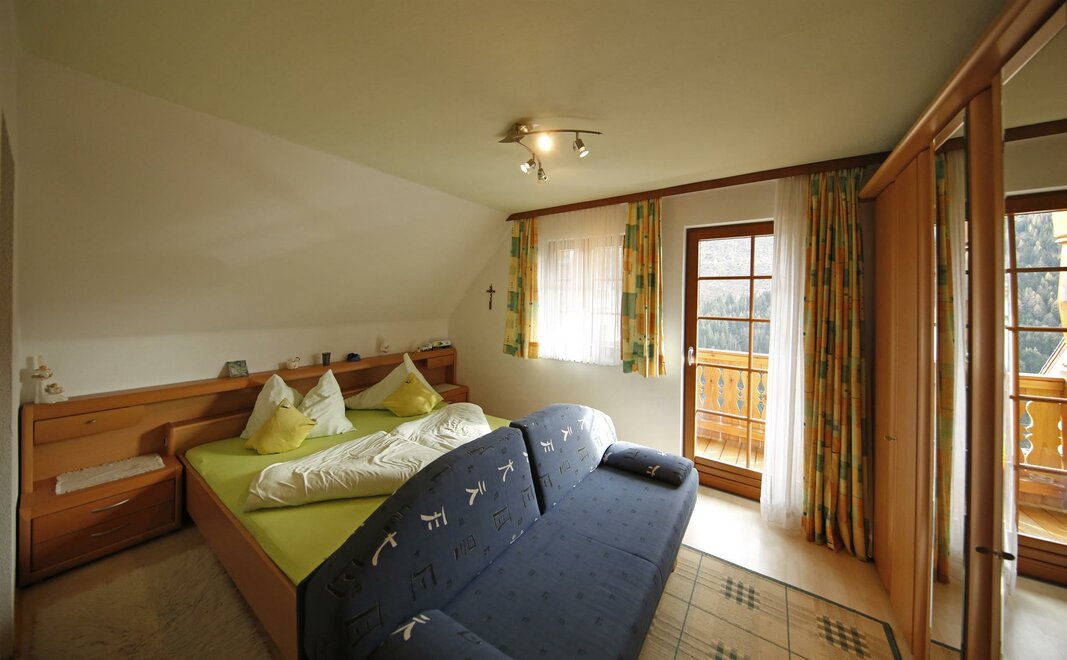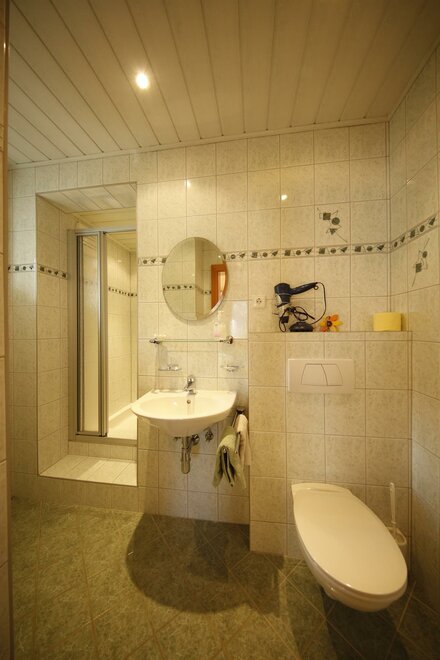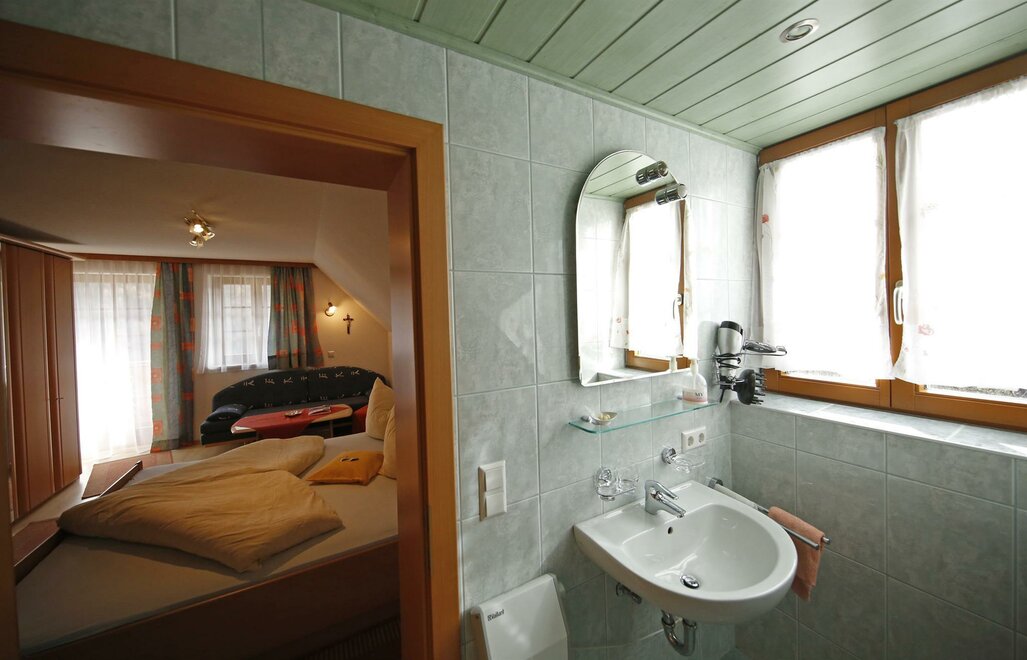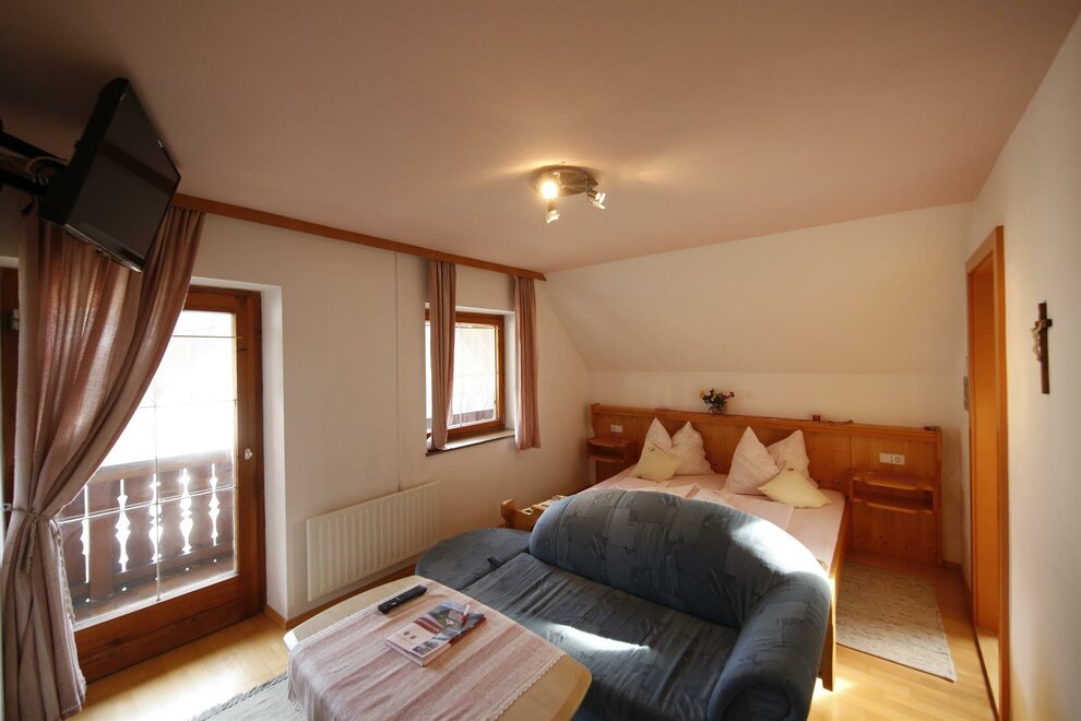 Przestronny pokój dwuosobowy, z sofą do spania i balkonem od strony południowej/południowo-wschodniej, aby cieszyć się górskim krajobrazem także w kwaterze Duża nowoczesna łazienka z prysznicem/toaletą, suszarką do włosów