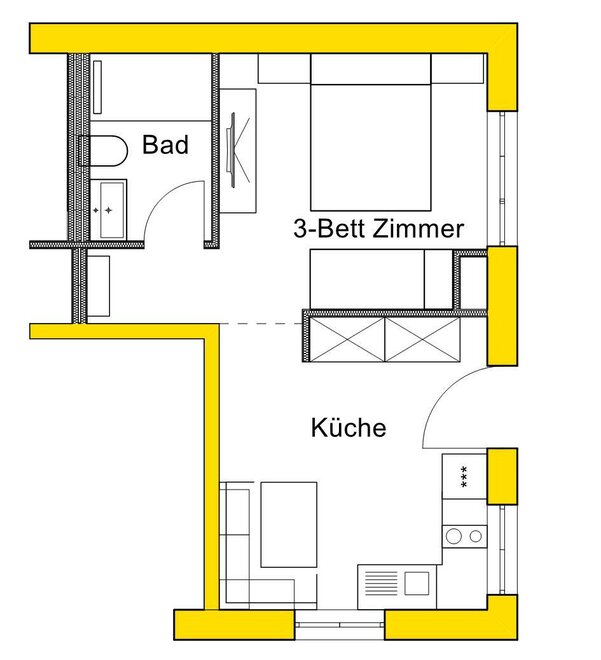Nasz przytulny, mały apartament 3 jest szczególnie dobrze dostosowany dla 2 dorosłych i 1 dziecka. Strefa dzienna i sypialna posiada w pełni wyposażony aneks kuchenny, stół jadalny oraz łóżko podwójne, łazienkę z prysznicem i WC. Kropką nad „i” jest jednak łóżko piętrowe nad łóżkiem podwójnym, które jest szczególnie popularne wśród dzieci.