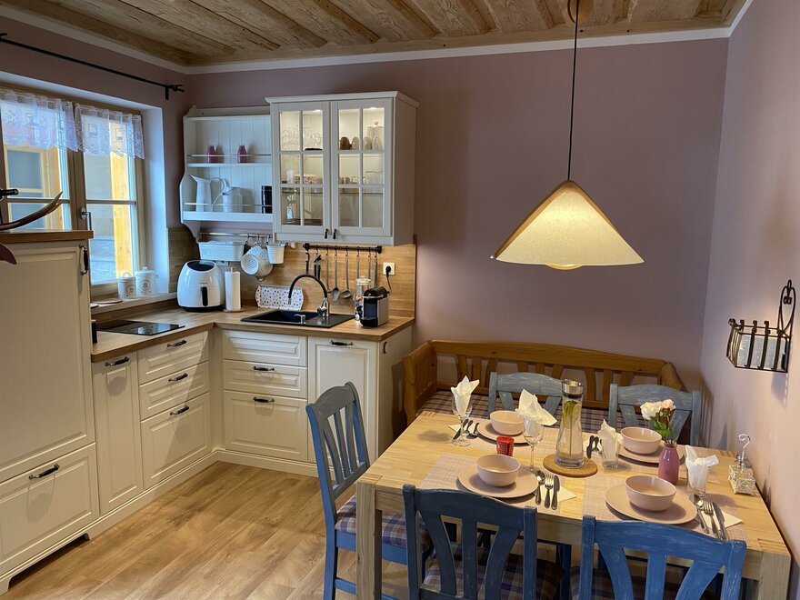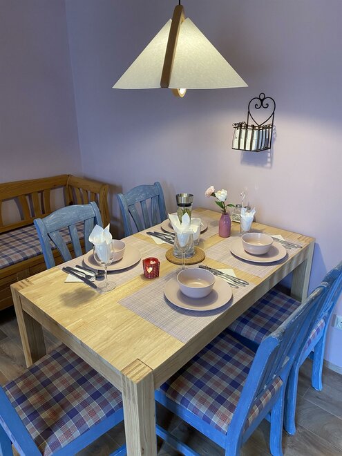 Nasz przytulny apartament 1 oferuje na powierzchni około 45 m² miejsce dla maksymalnie 5 osób. Jest wyposażony w 2 sypialnie, łazienkę oraz kuchnię. Komfortowa kuchnia ma przytulny kącik jadalny. Szczególnym „smaczkiem” w tym apartamencie jest telewizor satelitarny z Netflixem.