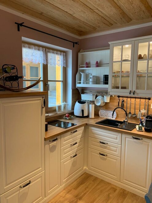 Przestronny apartament dla maksymalnie 5 osób, podzielony na pokój dwuosobowy oraz pokój trzyosobowy (łóżko piętrowe i 1 łóżko pojedyncze). Do dyspozycji jest także dobrze wyposażona kuchnia z przytulnym jadalnym oraz łazienka (z prysznicem i WC). Przedpokój z garderobą, telewizja satelitarna z Netflixem oraz bezpłatne Wi-Fi.