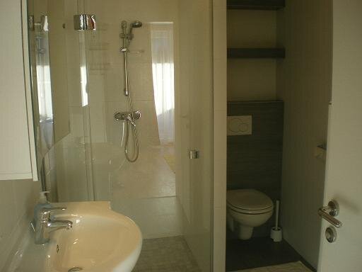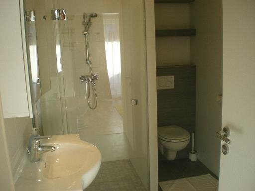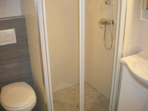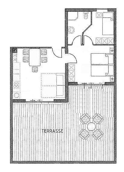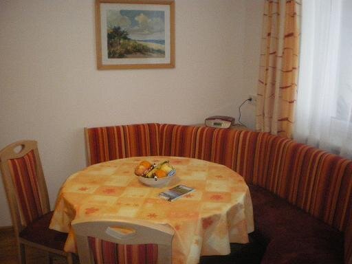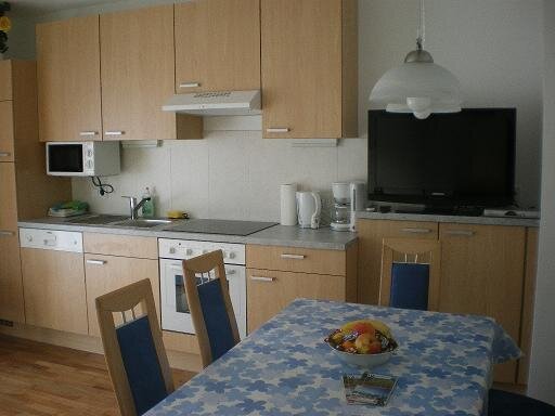 Przytulne mieszkanie na 1. piętrze, powierzchnia 44 m², 1 kuchnia z jadalnią i uroczym miejscem do siedzenia oraz rozkładaną kanapą dla 2 osób, 1 sypialnia z podwójnym łóżkiem, 1 sypialnia z łóżkiem piętrowym, 2 telewizory SAT, łazienka z prysznicem/WC, przestronny taras o powierzchni około 32 m²