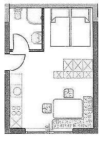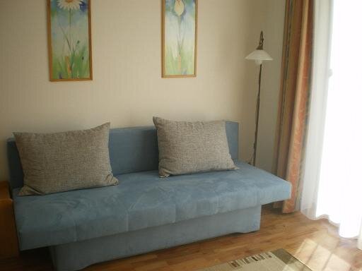 Przytulne mieszkanie na parterze, powierzchnia użytkowa 26 m², 1 pokój dzienny-sypialny z w pełni wyposażonym aneksem kuchennym, przestronnym kącikiem wypoczynkowym i jadalnym, telewizorem płaskoekranowym SAT, łazienka z prysznicem/wc