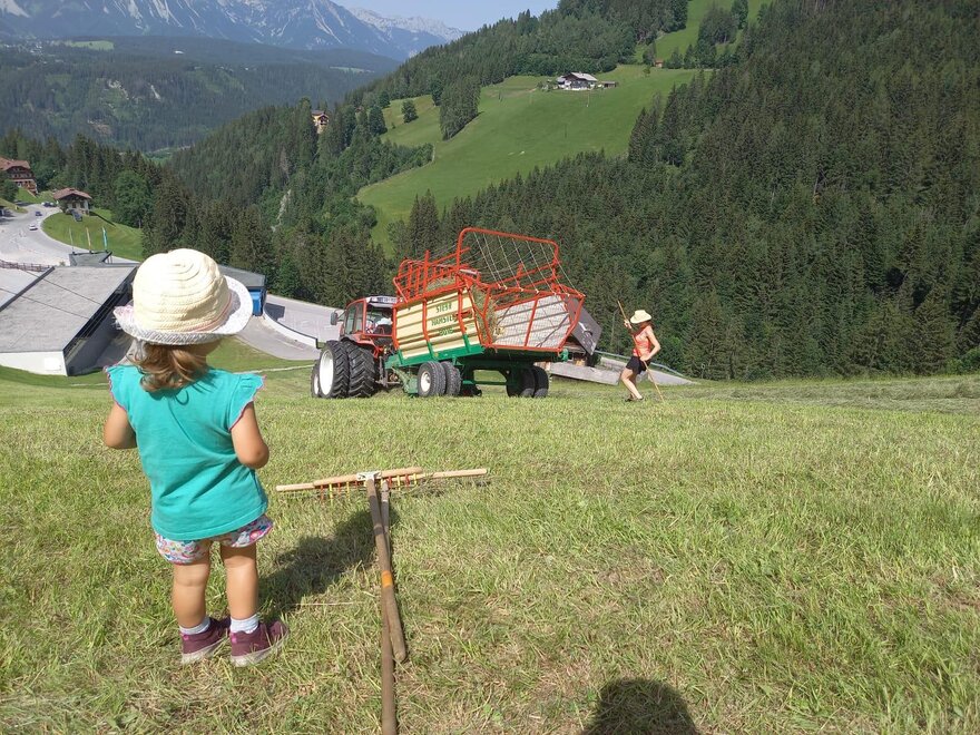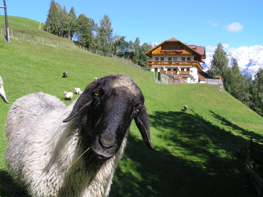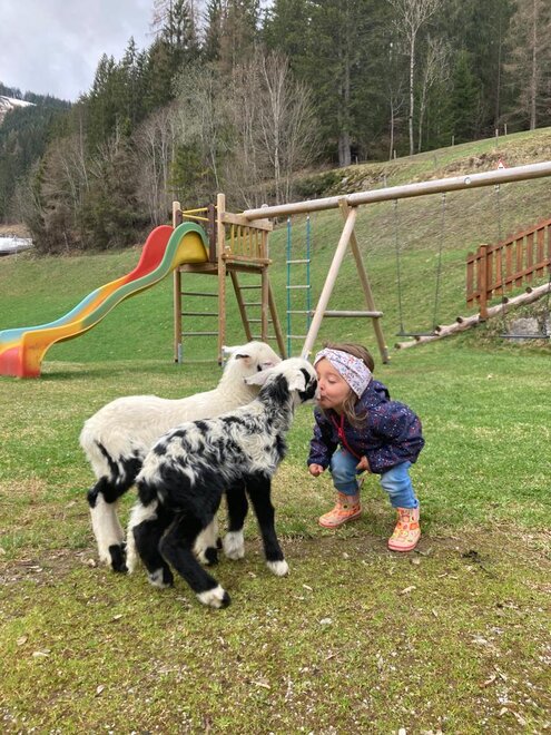Wasze dzieci mogą bawić się na placu zabaw w naszym gospodarstwie, głaskać zwierzęta, pluskać się w basenie,… W naszym Archehof hodujemy wyłącznie zagrożone gatunki zwierząt, takie jak Huzulskie konie górskie, Tuxer Zillertaler krowy i Alpejskie owce kamienne.