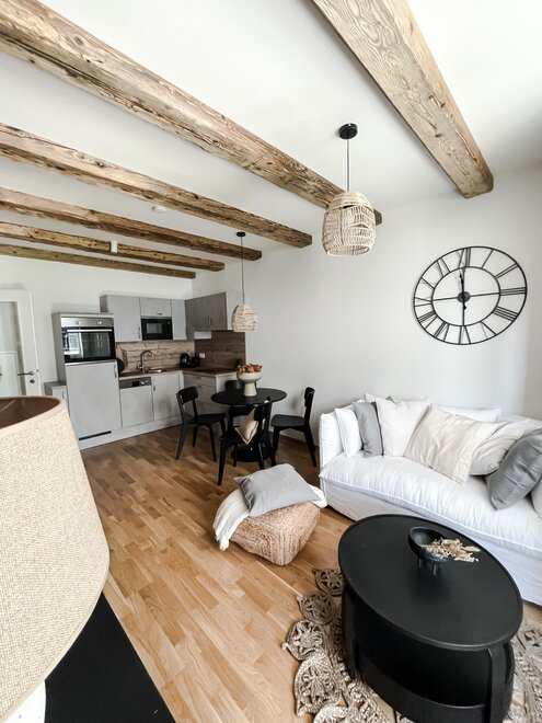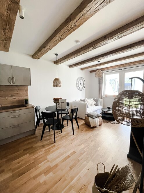 Nowoczesne mieszkanie na parterze jest przeznaczone dla maksymalnie sześciu osób. Dwie sypialnie, w pełni wyposażona kuchnia z salonem, stylowa łazienka, osobna toaleta oraz przytulny obszar wypoczynkowy z telewizorem płaskoekranowym zapewniają relaksujące dni urlopowe. Duży taras z widokiem na góry zachęca do spędzania czasu. Wi-Fi i telewizja satelitarna są wliczone w cenę. Karta letnia jest wliczona w cenę!