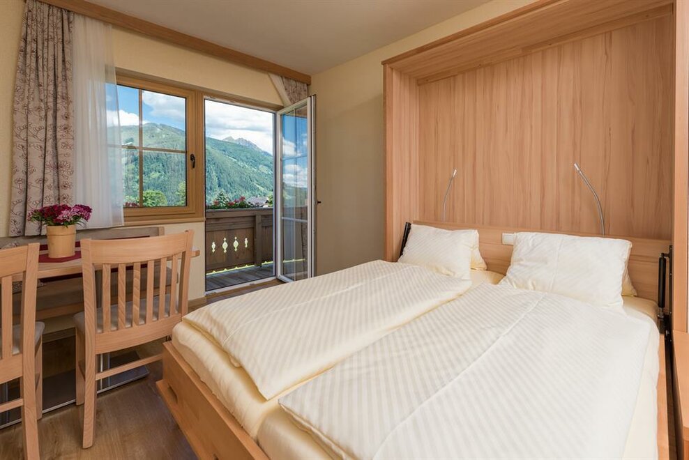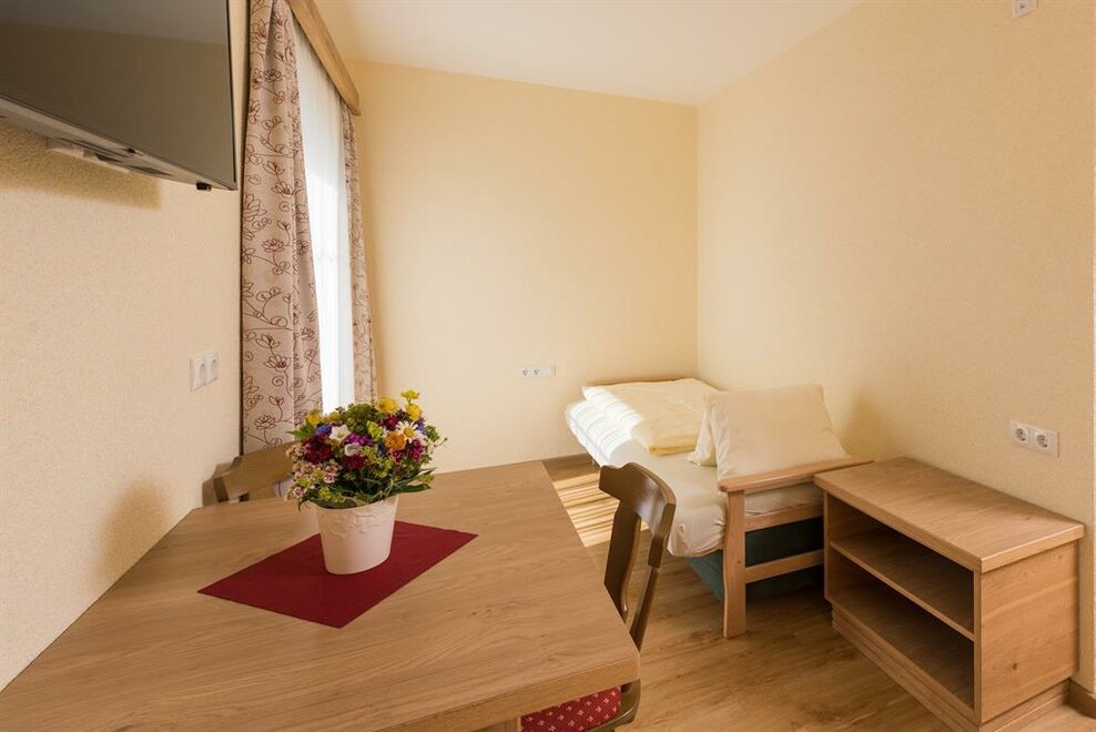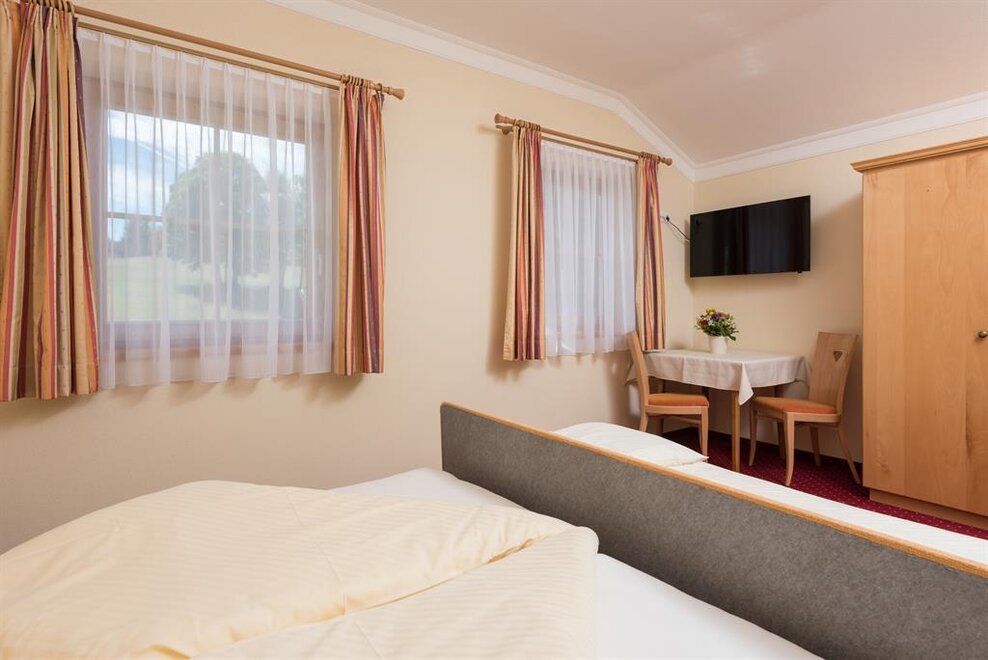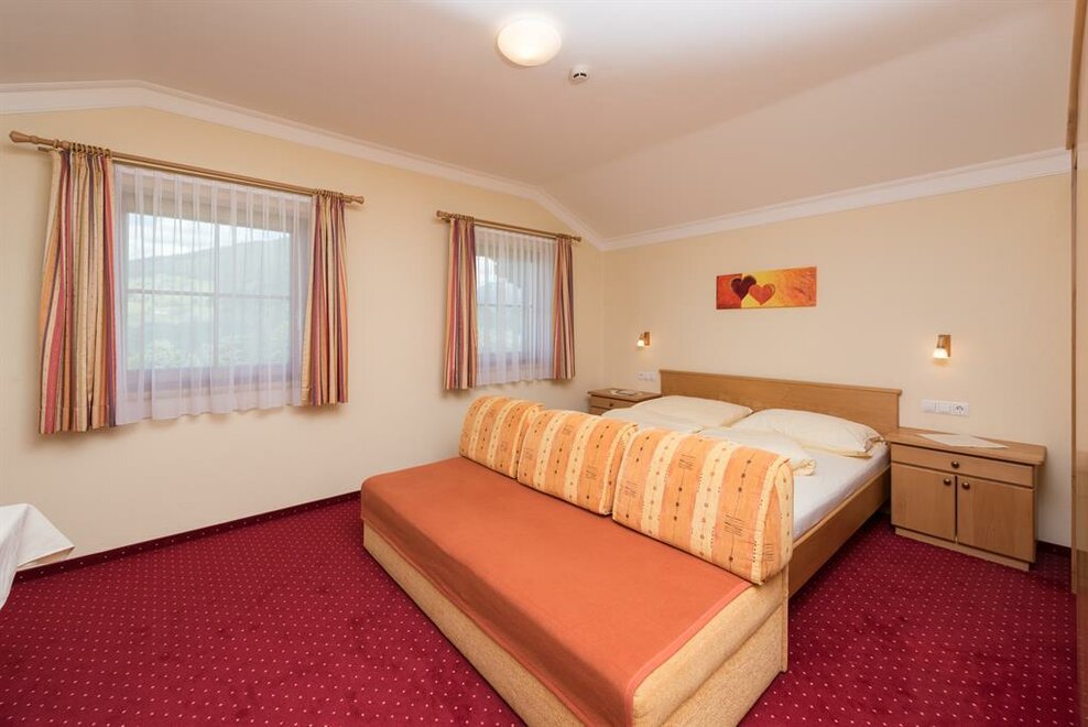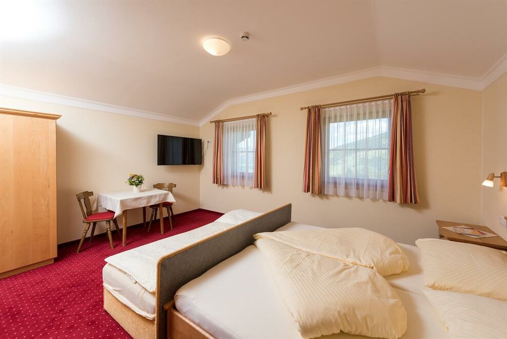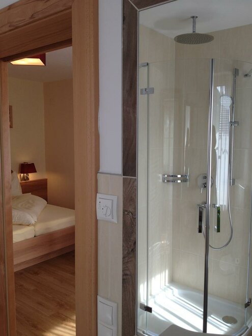 Wiosną 2016 roku starannie odnowiony pokój dwuosobowy z podwójnym łóżkiem, ręcznie wykonanymi meblami z dębu, kanapą (lub trzecim łóżkiem), stołem z 2 siedzeniami, ogrzewaniem podłogowym, darmowym WiFi, telewizją kablową oraz balkonem (słonecznym po południu) z widokiem na naszą górę Hochwurzen i w kierunku Reiteralm. Kiedy ma się szczęście, można w nocy przy otwartym oknie usłyszeć łagodne pluskanie strumyka przed domem. Łazienka wyposażona jest w umywalkę, prysznic, WC, ogrzewanie podłogowe, przestronny wieszak na ręczniki oraz wydajny suszarkę do włosów.