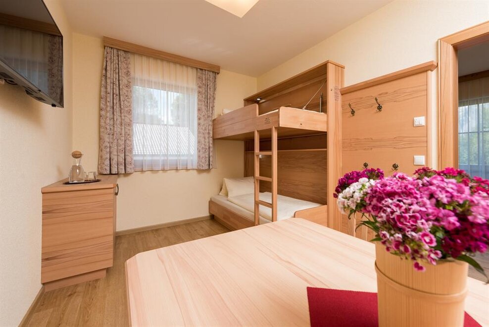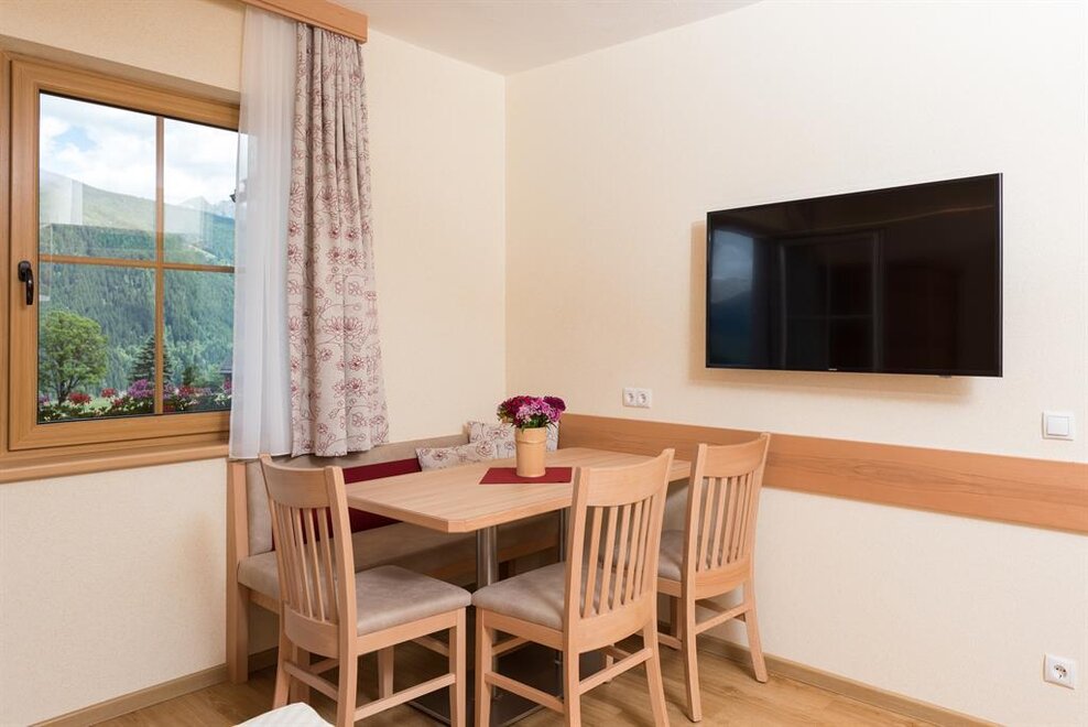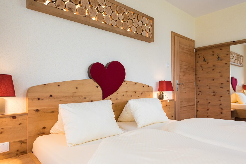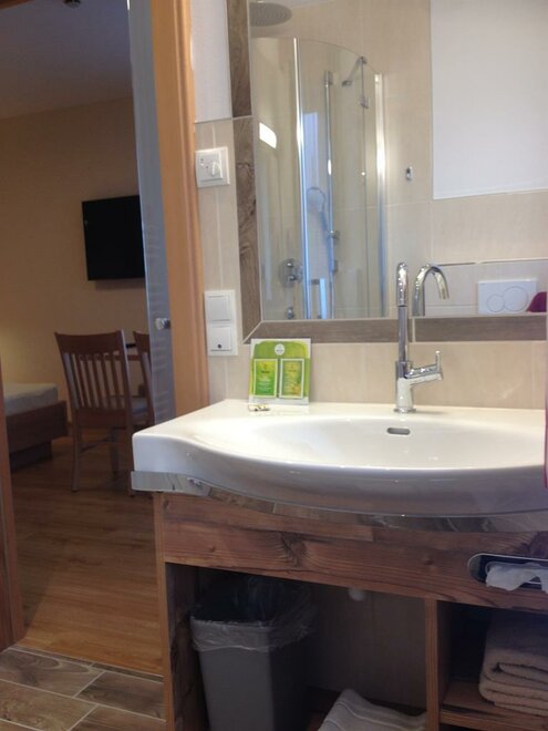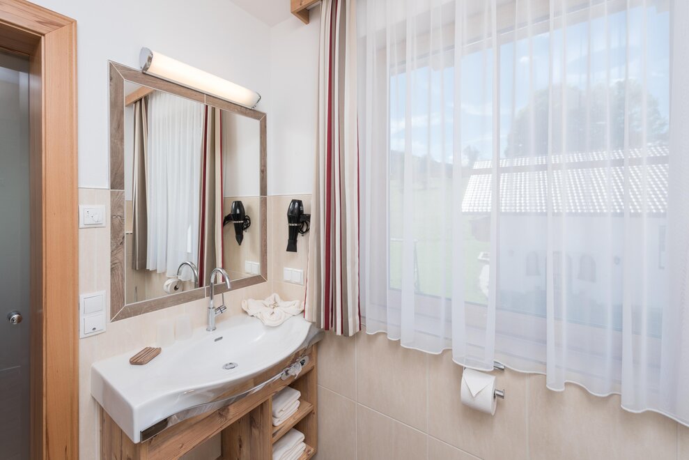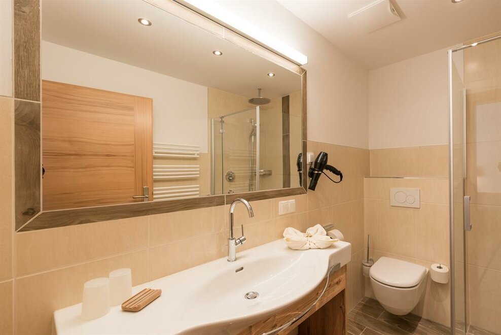 Wiosną 2016 roku starannie odnowiony pokój dwuosobowy z podwójnym łóżkiem, ręcznie wykonanymi meblami z dębu, kanapą (lub trzecim łóżkiem), stołem z 2 siedzeniami, ogrzewaniem podłogowym, darmowym WiFi, telewizją kablową oraz balkonem (słonecznym po południu) z widokiem na naszą górę Hochwurzen i w kierunku Reiteralm. Kiedy ma się szczęście, można w nocy przy otwartym oknie usłyszeć łagodne pluskanie strumyka przed domem. Łazienka wyposażona jest w umywalkę, prysznic, WC, ogrzewanie podłogowe, przestronny wieszak na ręczniki oraz wydajny suszarkę do włosów.