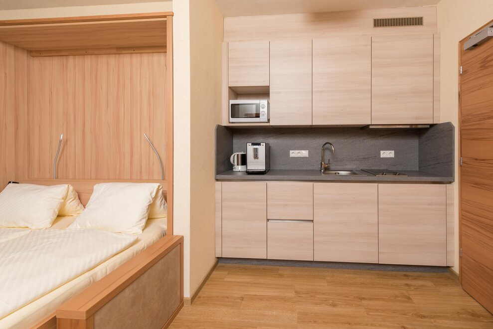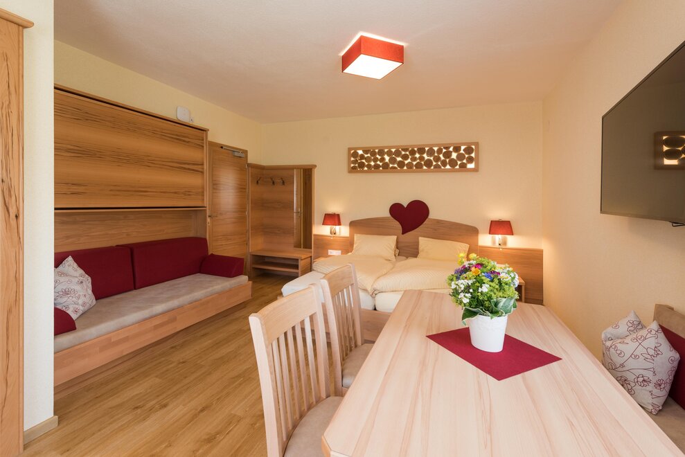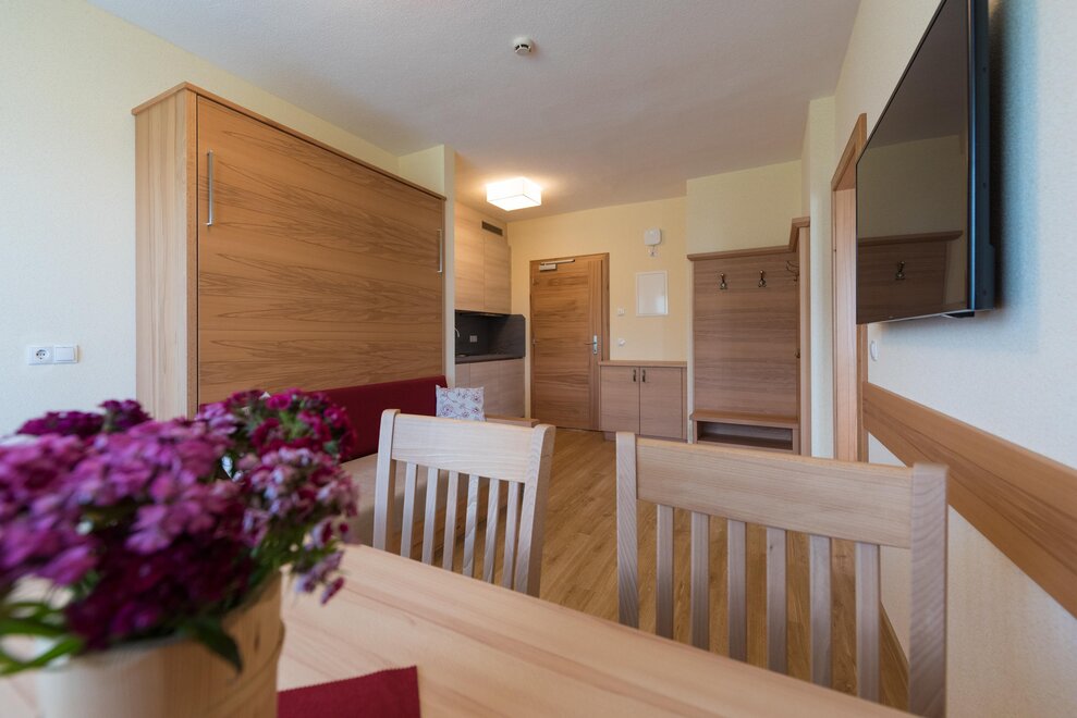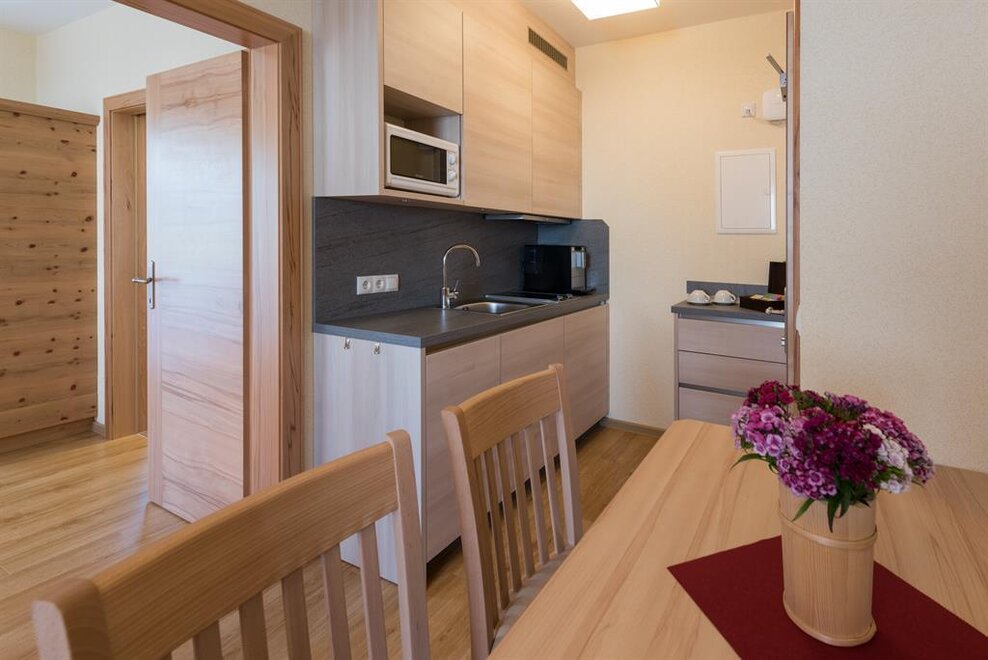 Wiosną 2016 całkowicie wyremontowane!!! Sypialnia: * Ręcznie wykonane meble z drewna czarnego * Podwójne łóżko z wysokiej jakości materacami Relaks z certyfikatem QUL * Telewizja kablowa * Balkon z widokiem na dolinę i poranny słońce Łazienka: * Umywalka * Prysznic * WC * Suszarka do ręczników * Wydajna suszarka do włosów Pokój dzienny: * Przytulny kącik z stołem * Telewizja kablowa * Kanapa (znika w razie potrzeby w ścianie, a pojawia się podwójne łóżko) * Łóżko piętrowe (znika w ścianie, gdy nie jest potrzebne) Kuchnia: * 2 płyty grzewcze * Mikrofalówka * Lodówka * Ekspres do kawy * Zmywarka * Czajnik * Naczynia i ręczniki kuchenne Cała suite: * Ogrzewanie podłogowe * bezpłatne WiFi