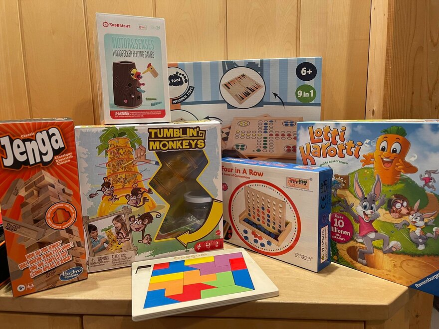 Dostępne gry planszowe – m.in. Lotti Karotti, Cztery w rzędzie, UNO, Jenga i inne.