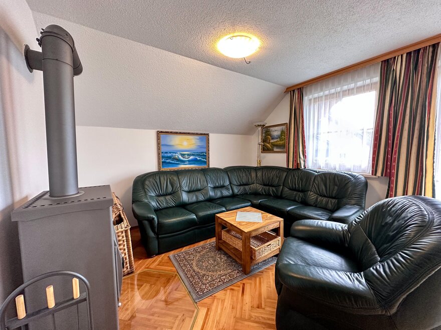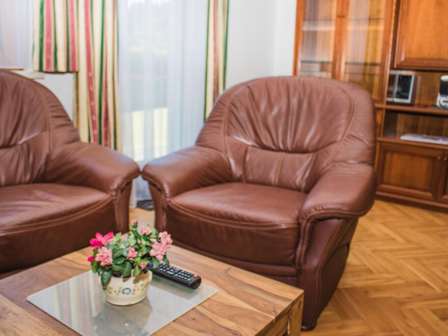 Każde z 2 nowych mieszkań wakacyjnych ma 3 osobne sypialnie dwuosobowe z telewizją satelitarną, podwójną sofę w salonie z piecem szwedzkim, (4 sypialnie), 2 WC, osobno dla kobiet i mężczyzn oraz 2 prysznice, przedpokój z garderobą, pomieszczenie do przechowywania oraz w pełni wyposażoną kuchnię z jadalnią, we wszystkich pokojach dziennych i sypialniach elektryczne rolety, w wszystkich sypiąłniach pościel hipoalergiczna oraz podłogi drewniane oraz w całym domu wakacyjnym Karin podłogi hipoalergiczne. Bezpłatne miejsca parkingowe, bezpłatne Wi-Fi, telewizja satelitarna, balkon / zadaszony taras z meblami balkonowymi, ogród z meblami ogrodowymi i widokiem na najwyższą samodzielną górę w Europie, Grimming 2351 m