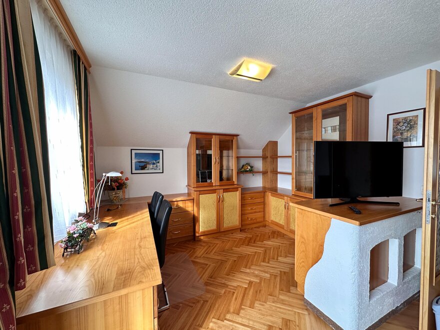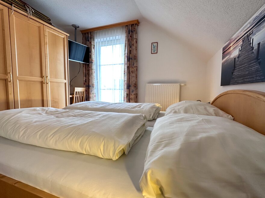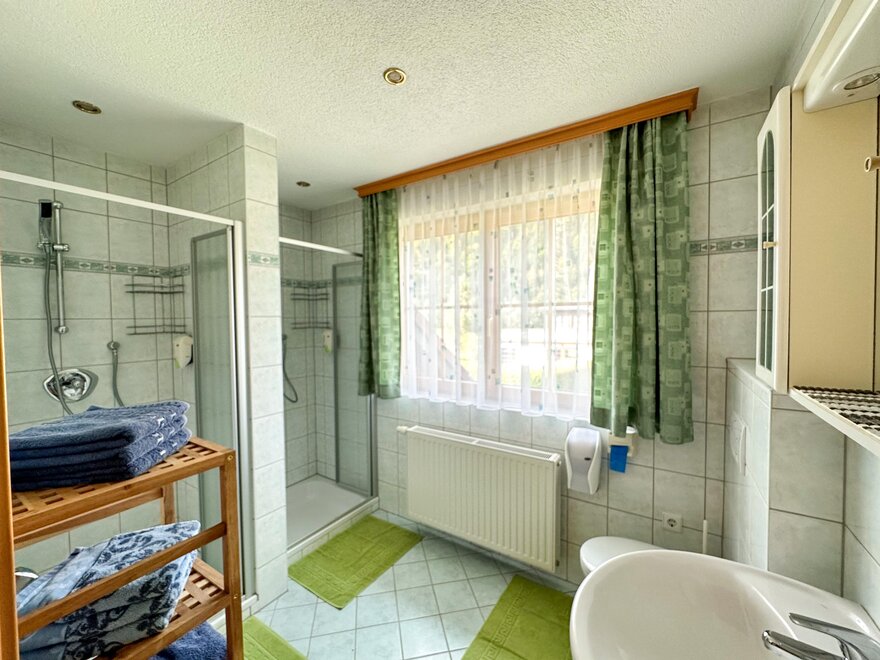 Każde z 2 nowych apartamentów ma 3 oddzielne dwuosobowe sypialnie z telewizją satelitarną, podwójna rozkładaną sofę w salonie z kominkiem, (4 miejsca do spania), 2 WC, oddzielne dla kobiet i mężczyzn oraz 2 prysznice, przedsionek z garderobą, schowek i w pełni wyposażoną kuchnię z jadalnią, we wszystkich pomieszczeniach mieszkalnych i sypialnych elektryczne rolety, w sypialniach pościel hypoalergiczna i podłogi parkietowe oraz w całym domu wakacyjnym Karin hypoalergiczne podłogi. Darmowe miejsca parkingowe, darmowe Wi-Fi, telewizja satelitarna, balkon / zadaszony taras z meblami balkonowymi, ogród z meblami ogrodowymi i widokiem na najwyższą samotną górę Europy, Grimming 2.351 m