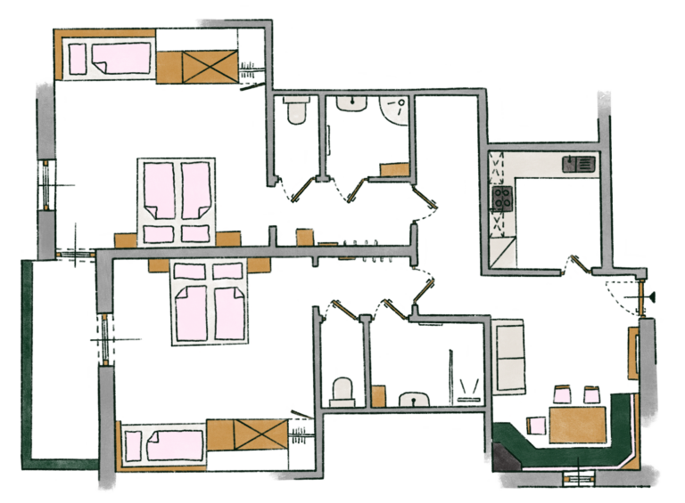 Pokój rodzinny składa się z pokoju dwuosobowego oraz pokoju z dwoma łóżkami, każdy z prysznicem/WC, a pokoje połączone są małym przedpokojem.