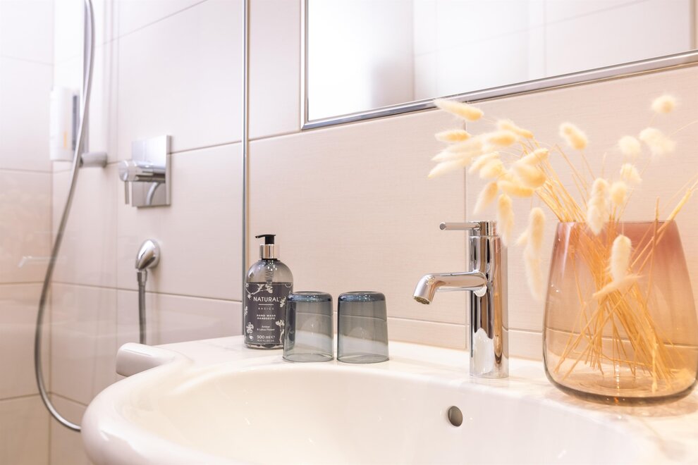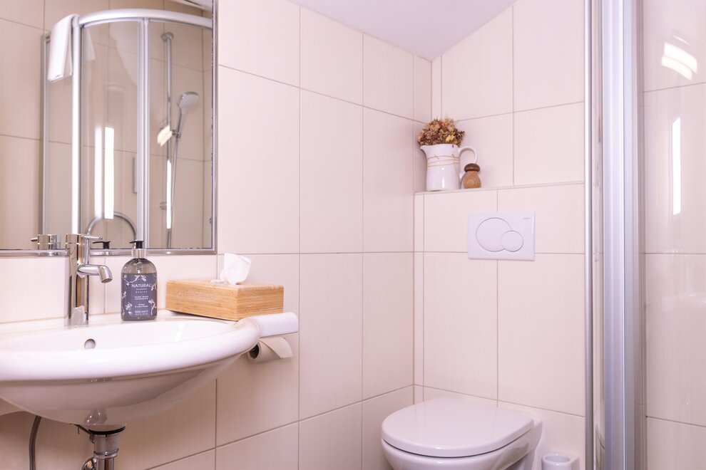 Łazienki zostały wykończone kafelkami w wyglądzie drewna oraz marmurem z regionu, a sofa z typowej dla Schladming tkaniny loden nadaje pokojowi przytulną atmosferę.Wyposażenie pokoi: