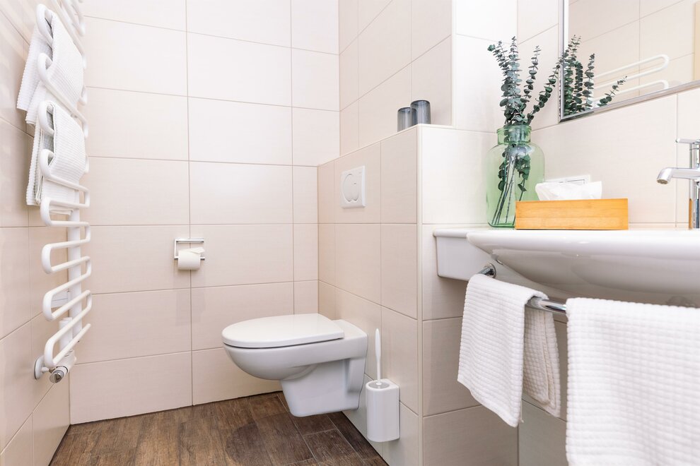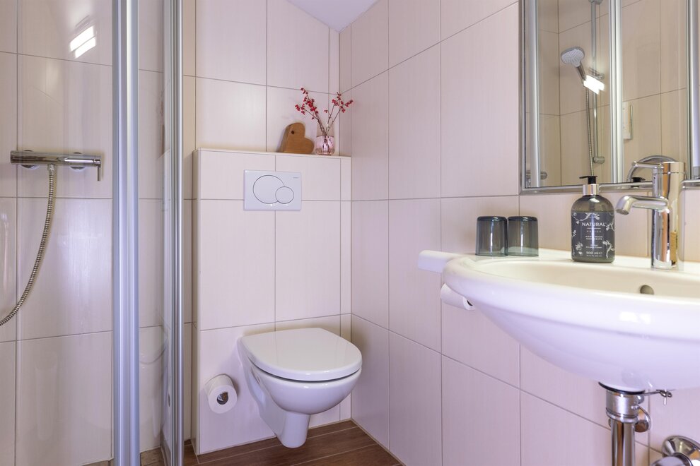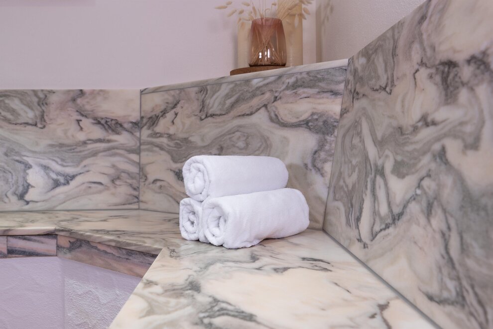Łazienki zostały zaprojektowane z płytkami w wyglądzie drewna i marmurem z regionu, a kanapa z typowego loden z Schladming nadaje pokojowi przytulną atmosferę.Wyposażenie pokoi: