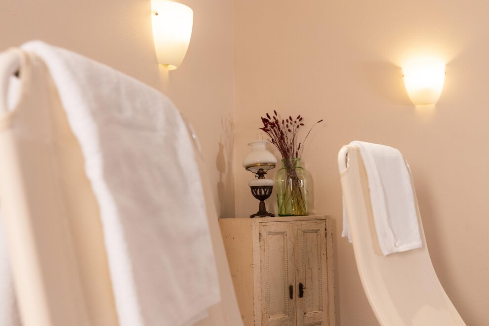 Łazienki zostały zaprojektowane z płytkami z marmuru Sölker, a sofa z typowego szlafmyrskiego loden nadaje pokojowi przytulną atmosferę.Wyposażenie pokoi: