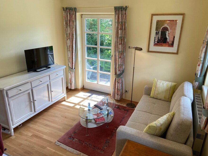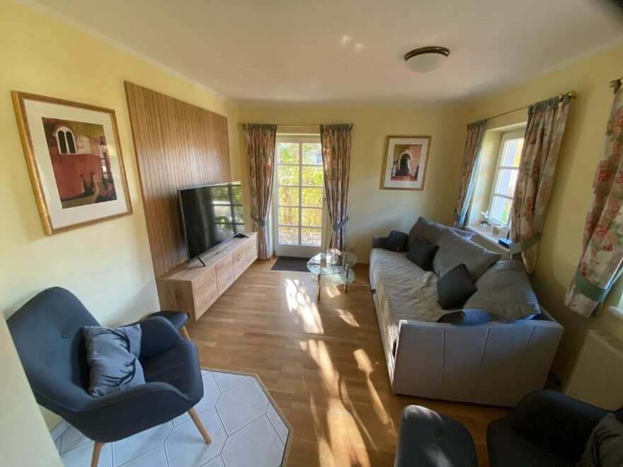 ogród, taras, zwierzeta domowe za porozumieniem, czajnik bezprzewodowy, ogrzewanie, meble ogrodowe, lodówka, pokój rodzinny, pojemnik do zamrażania, zmywarka, naczynia kuchenne do dyspozycji gości, piekarnik, łąka, naczynia kuchenne, podłoga wyłożona płytkami albo marmurem, salon/sypialnia oddzielone, WiFi, podstawy (Ręczniki, pościel, mydło i papier toaletowy), kuchenka mikrofalowa, telewizor, oddzielna sypialnia: 2, kuchenka elektryczna, Größe m²: 65, zlew do mycia naczyń, kuchnia, przedpokój, ekspres do kawy, możliwość przygotowywania posiłków, pokój dla niepalących, wentylator