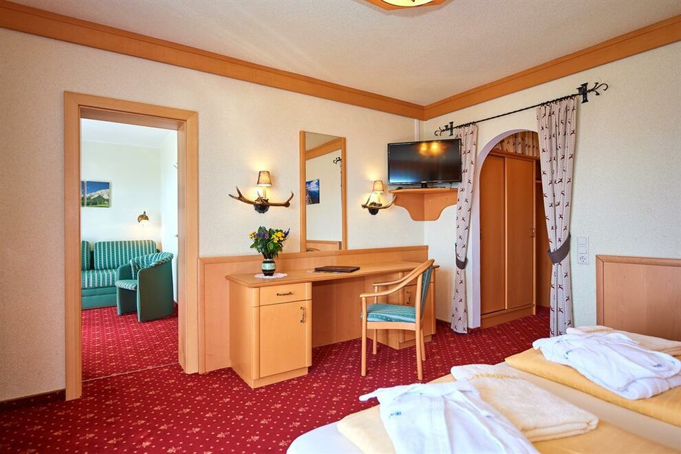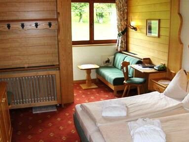 Jasny, przyjazny i ładnie urządzony pokój dwuosobowy (Typ A) "Dachstein" (ok. 20 m²) dla niepalących bez balkonu z widokiem na masyw Dachstein, w tym prysznic, WC, kącik wypoczynkowy, biurko, telefon, telewizję satelitarną, WiFi, sejf, suszarkę do włosów i szlafroki