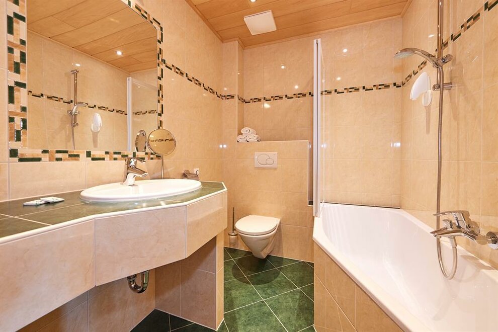 Jasny, przyjazny i pięknie urządzony pokój dwuosobowy (typ B) "Tauern" (około 22-23 m²) dla niepalących z dużym balkonem (widok na Tauern / Hochkönig) w tym łazienka/prysznic, WC, kanapa, biurko, telefon, telewizja satelitarna, Wi-Fi, sejf, suszarka, szlafroki