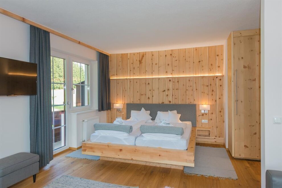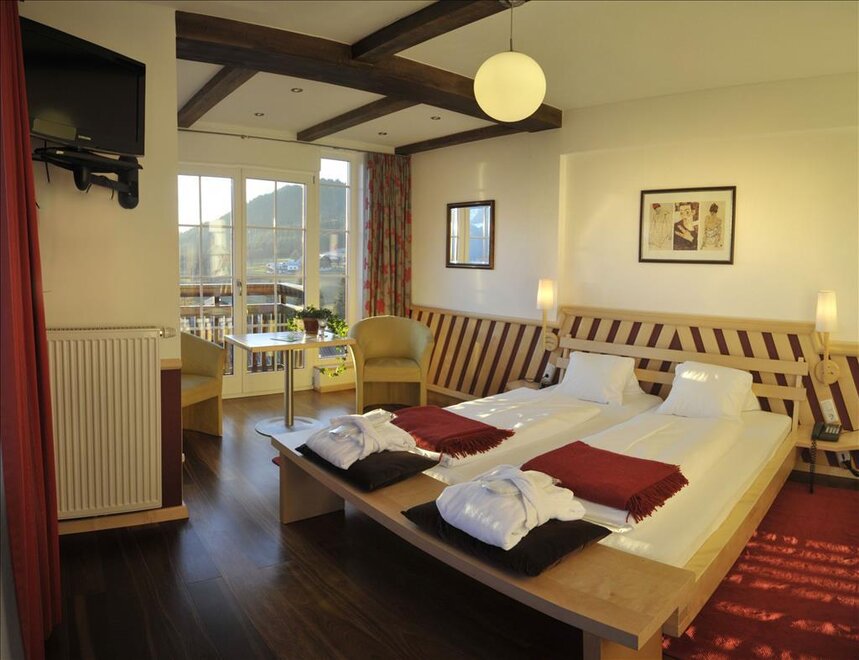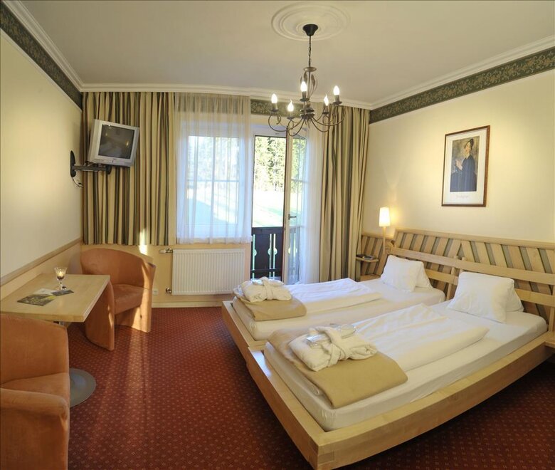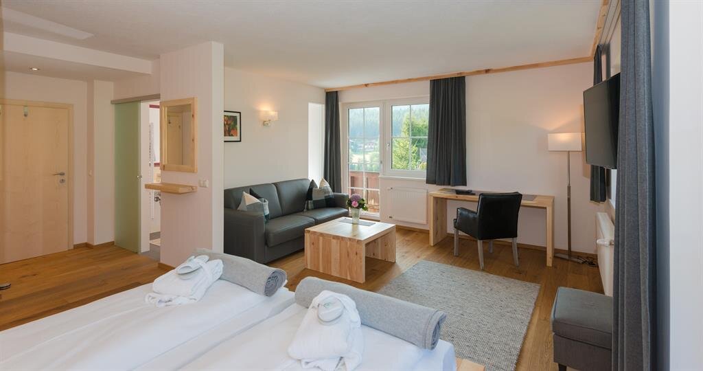 TYP C "Pokój rodzinny lub suite z modrzewiem" •Pokój dzienny/sypialnia oraz oddzielna sypialnia •wysokiej jakości meble z litego drewna klonowego lub modrzewiowego •około 46 m² •eleganckie podłogi drewniane i dywanowe •przytulny kącik wypoczynkowy •balkon lub okno panoramiczne z widokiem na góry Dachstein lub Schladminger Tauern •telewizor płaskoekranowy, telewizja satelitarna, budzik radiowy, WLAN, sejf •łazienka i WC oddzielnie •łazienka z suszarką do włosów, lustrem do makijażu •miękkie szlafroki, kapcie