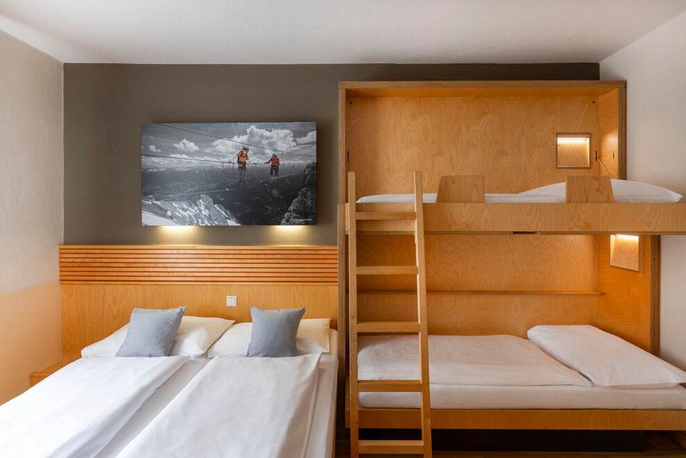 Jasne i przyjazne pokoje z elastycznymi systemami łóżkowymi (podwójne, pojedyncze, sofy i piętrowe), funkcjonalne wyposażenie z naturalnych i regionalnych surowców. Łazienka z prysznicem/WC
