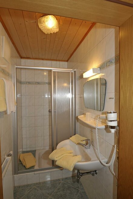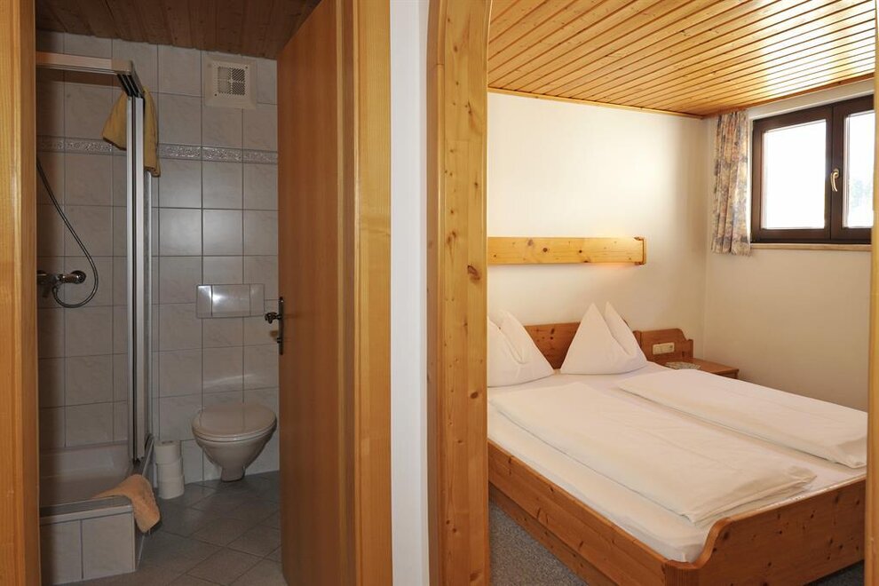 Pokój dwuosobowy/prysznic/toaleta, częściowo z balkonem oraz urządzony w drewnie świerkowym lub bukowym.