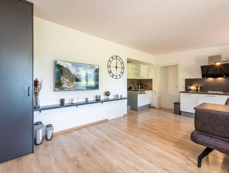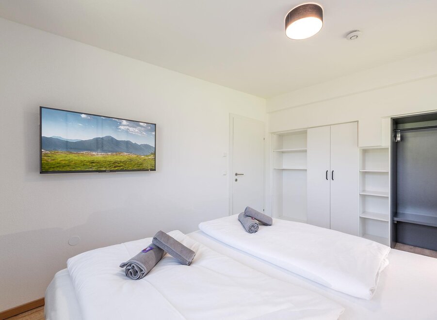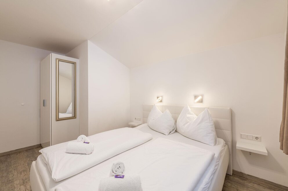 Nasze 70 m² apartament Mountain Love I na 1. piętrze oferuje duży pokój dzienny/jadalnię z w pełni wyposażoną kuchnią, łazienkę z prysznicem oraz osobną toaletę. Apartament dysponuje dwoma oddzielnymi sypialniami z podwójnym łóżkiem oraz wysokiej jakości rozkładaną sofą z wbudowanym materacem dla dwóch dodatkowych osób. Dla Twojego niemowlęcia lub małego dziecka chętnie zapewnimy łóżeczko bezpłatnie!