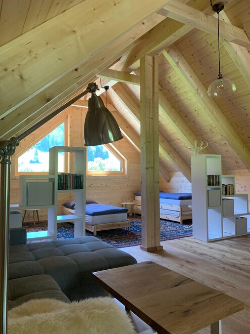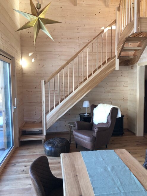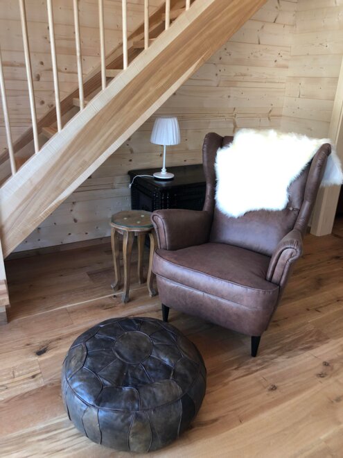 Opis: Na parterze znajduje się sypialnia, łazienka z prysznicem, WC, pomieszczenie na narty i buty narciarskie oraz bardzo dobrze wyposażona kuchnia z jadalnią z przytulnymi fotelami. Wąską klatką schodową można dostać się na przestronną galerię z widokowym dachem, gdzie znajdują się wygodna kanapa, telewizor oraz łóżka dla maksymalnie 4 dodatkowych osób. Książki i DVD są gotowe do użycia, a wiele gier familijnych znajduje się na dole w szafie.