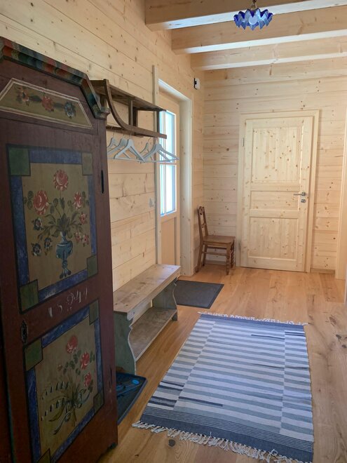 Dom z drewna na parterze składa się z przedsionka, z którego prowadzi prysznic, sypialnia dla 2 osób, WC, pomieszczenie gospodarcze z pralką oraz w pełni wyposażona kuchnia z salonem. Z kuchni z salonem, która jest otwarta na górę z widokowym dachem, prowadzą wąskie schody do przestronnej kondygnacji z 2-4 łóżkami, sofą oraz telewizorem z odtwarzaczem DVD.