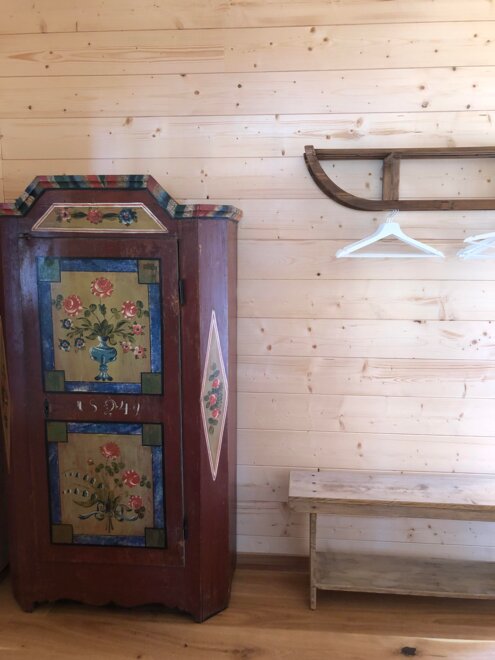 Na parterze znajduje się sypialnia, łazienka z prysznicem, WC, pomieszczenie na narty i buty narciarskie oraz dobrze wyposażona kuchnia z przytulnym fotelem. Wąskimi schodami można dostać się na przestronną galerię z widokowym dachem, gdzie znajduje się wygodna sofa i łóżka dla dodatkowych 4 osób.