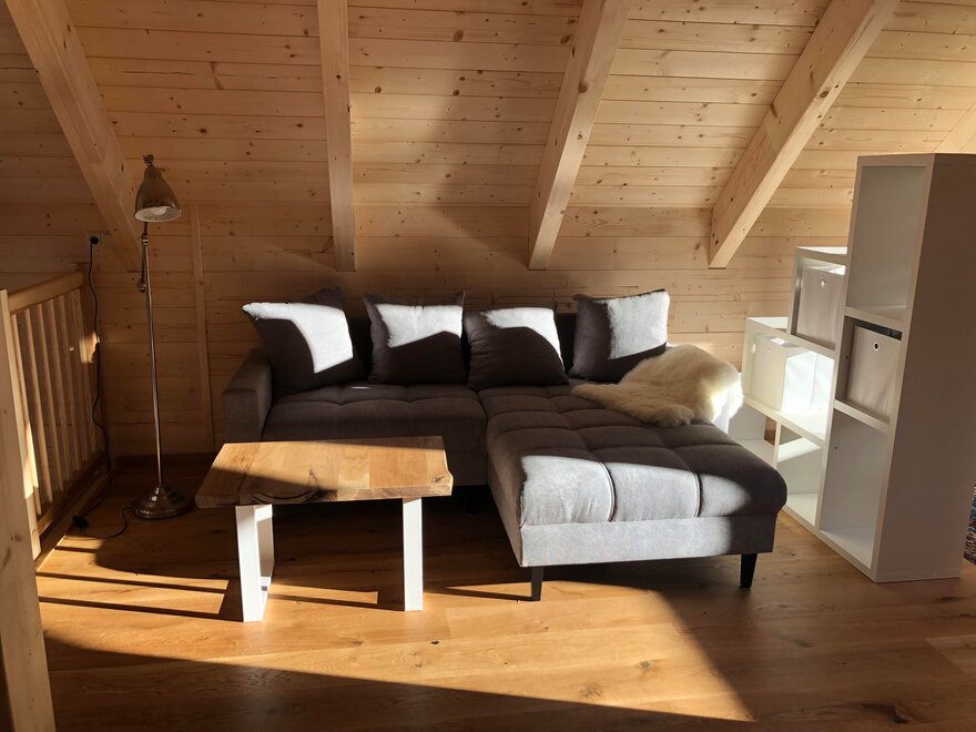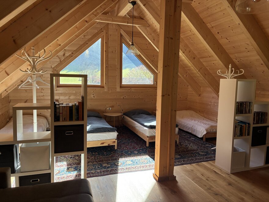 Schody prowadzą do drugiego miejsca sypialnianego, gdzie dostępne są 2-4 łóżka. Znajdziecie tam wygodną sofę, telewizor, odtwarzacz DVD, książki w różnych językach - można je również kontynuować w domu - ewentualnie wymieńcie je na własną książkę. Gry rodzinne/Lego znajdziecie w szafie w przedpokoju.