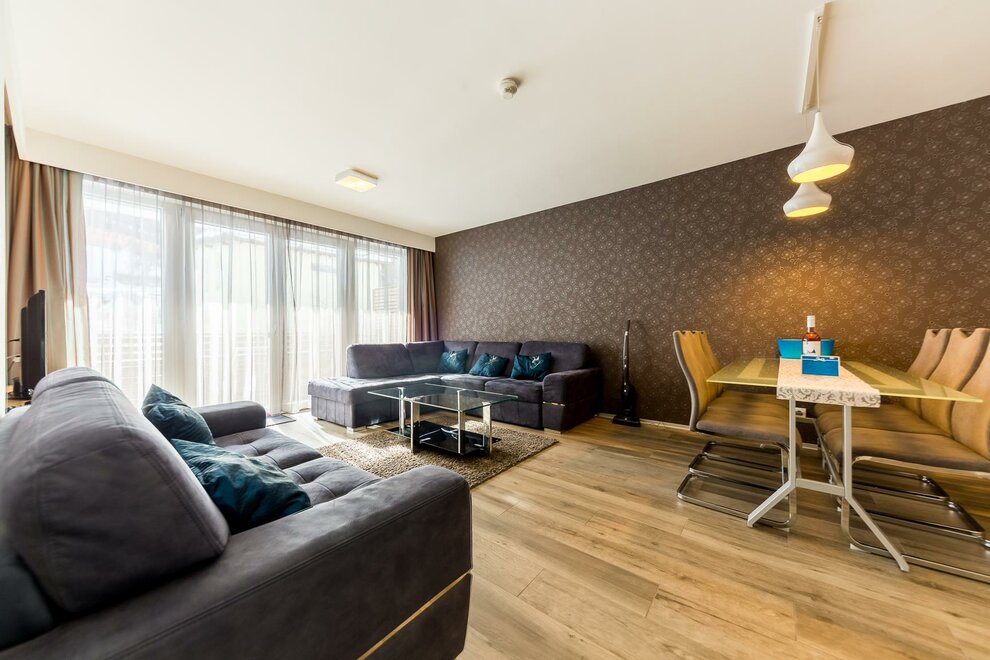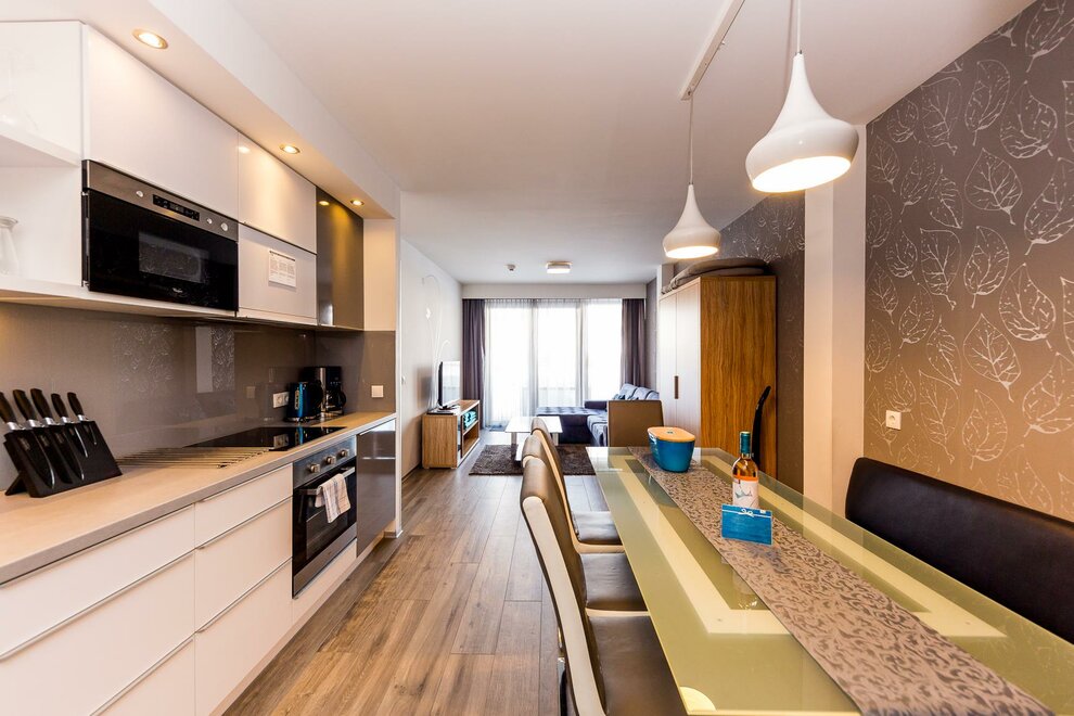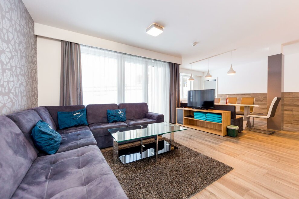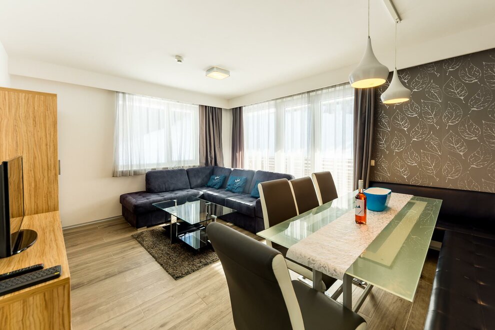 Apartament z salonem i czterema oddzielnymi sypialniami. Apartament premium obejmuje jadalnię, w pełni wyposażony aneks kuchenny oraz dwie łazienki z prysznicem. Do apartamentu przynależy również taras (16 m2). Apartament premium jest idealny dla 2 rodzin.