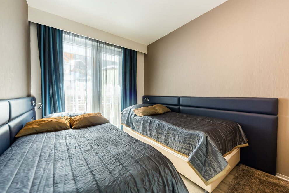 Apartament z salonem i trzema osobnymi sypialniami. Dodatkowy apartament obejmuje jadalnię, w pełni wyposażony aneks kuchenny, 2 łazienki z prysznicem oraz taras (9-25m2).