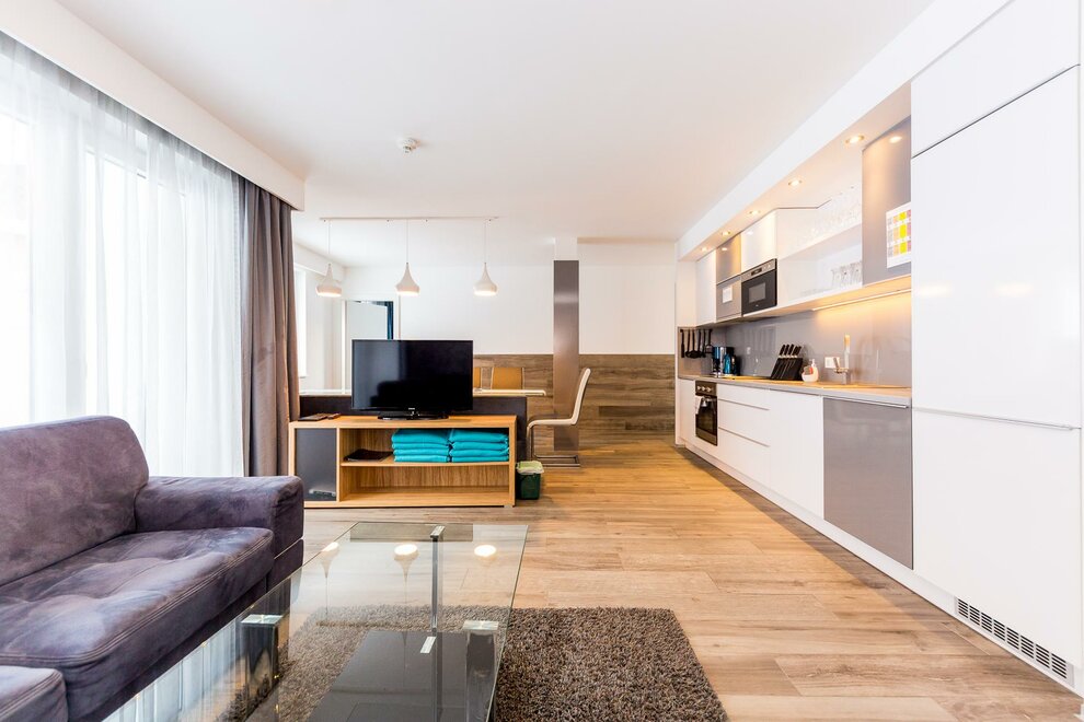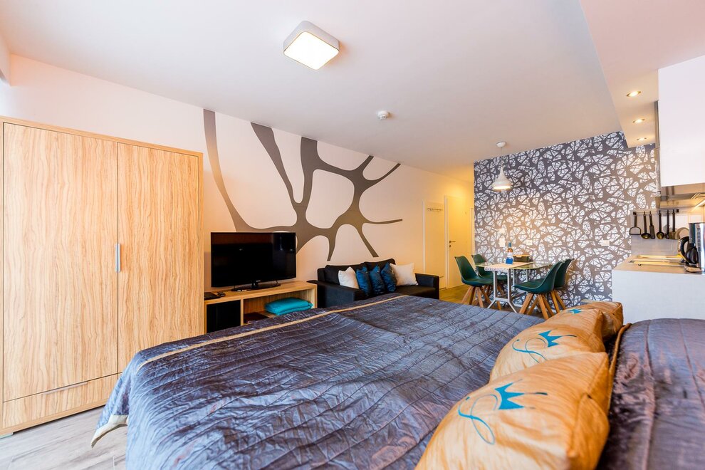Kawalerka. Salon/sypialnia jest wyposażona w podwójne łóżko oraz rozkładaną sofę. Do studia przynależy jadalnia, w pełni wyposażony aneks kuchenny, łazienka z prysznicem oraz taras (7 m2).