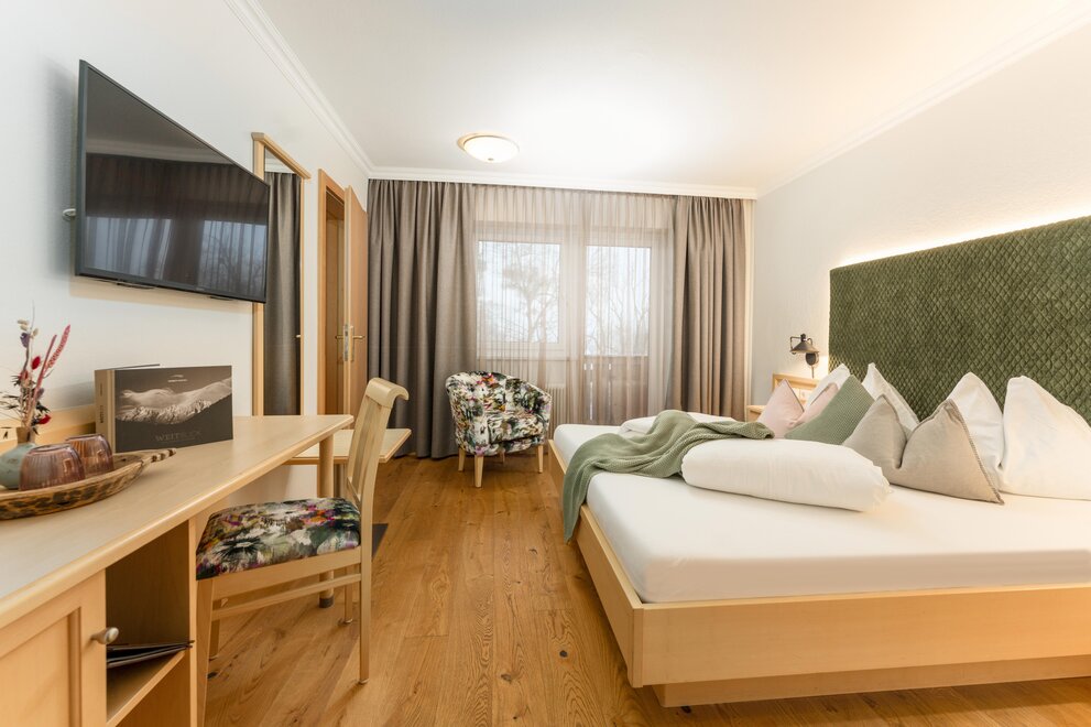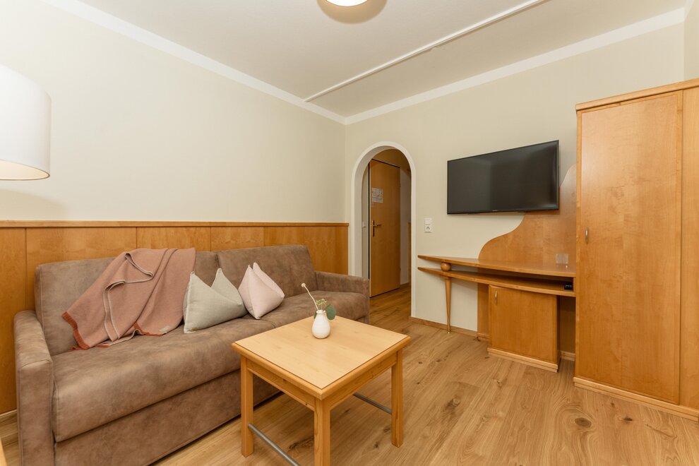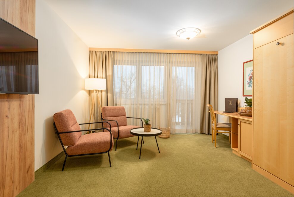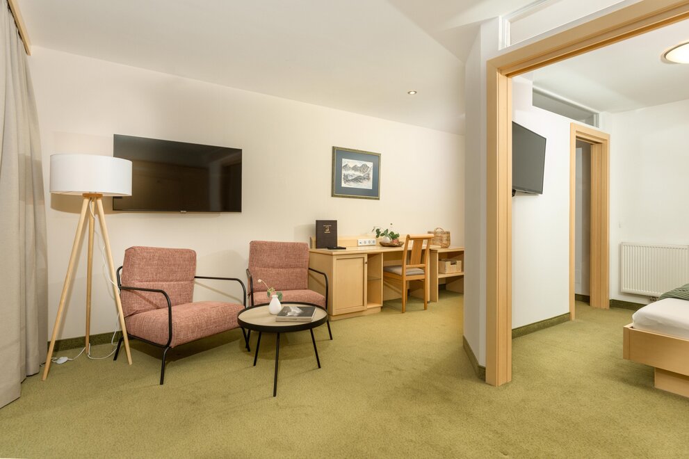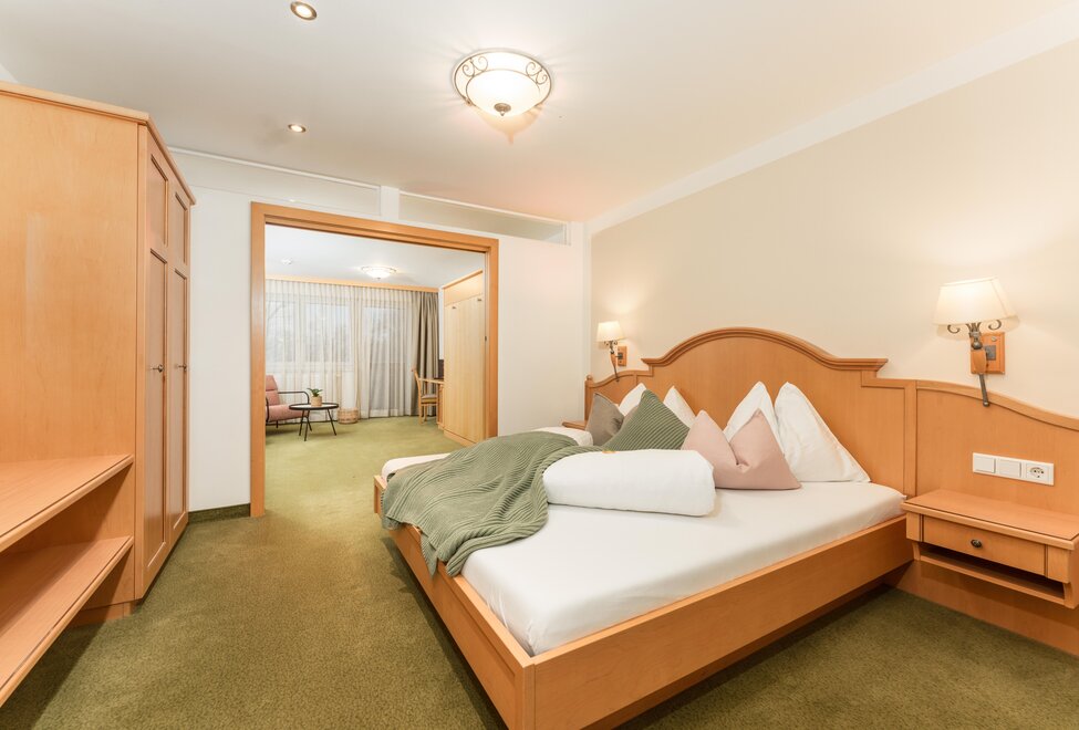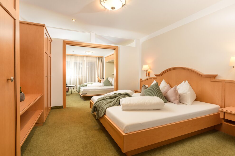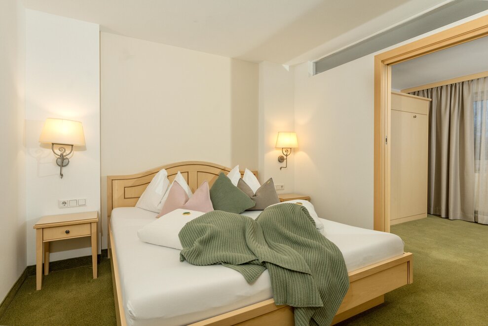 Piękne jasne apartamenty hotelowe/Juniorsuite o powierzchni około 42m² (2 sypialnie z drzwiami przesuwnymi do oddzielenia) Łazienka i WC oddzielnie, suszarka do włosów, część wypoczynkowa, telefon, 2 telewizory kablowe, sejf, Wi-Fi i duży słoneczny balkon.
