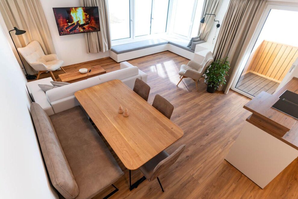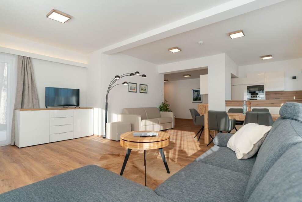 97m² / Salon / 2 sypialnie / Łazienka z prysznicem i dodatkowym WC / 1 WC / Kuchnia z urządzeniami Miele: zmywarka, mikrofalówka, piekarnik, płyta grzewcza, ekspres do kawy / Smart TV / W-LAN / pościel / ręczniki / Loggia 11m²
