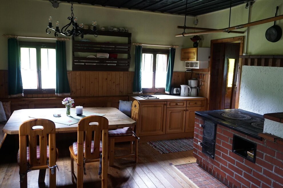 piec opalany drewnem, kuchenka mikrofalowa, ekspres do kawy, piec kaflowy, jadalnia, skandynawski kominek, toster, radio, naczynia kuchenne do dyspozycji gości, kuchnia, salon/sypialnia oddzielone
