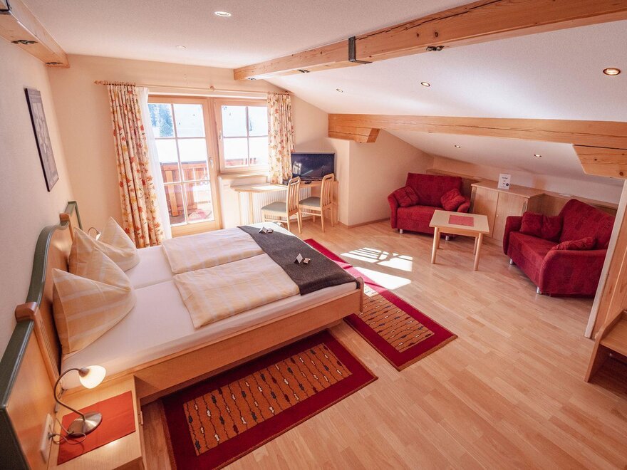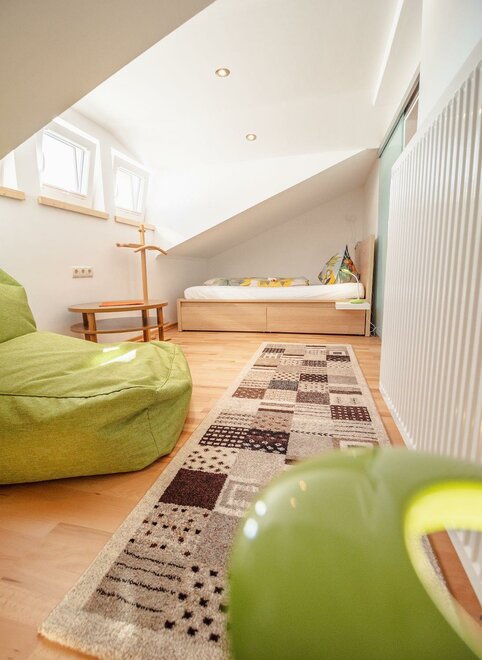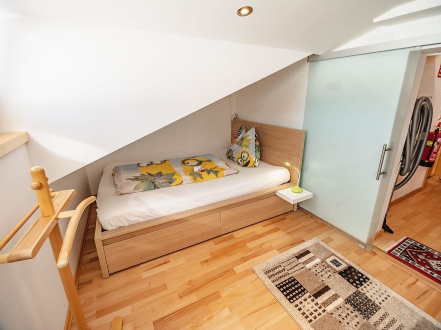 Południowo usytuowane mieszkanie na poddaszu o powierzchni około 85 m² jest idealnym apartamentem dla rodzin od 2 do 6 osób i oferuje wszelkie udogodnienia, jakich pragniecie podczas wakacji. Przytulnie urządzony pokój dzienny z dużą częścią wypoczynkową i wygodną kanapą, a także w pełni wyposażona kuchnia stwarza idealne warunki do relaksu. W przestronnej sypialni (łóżko podwójne, + opcjonalnie 2 łóżka pojedyncze), w dodatkowej sypialni oraz dwóch łazienkach z pewnością poczujecie się komfortowo.